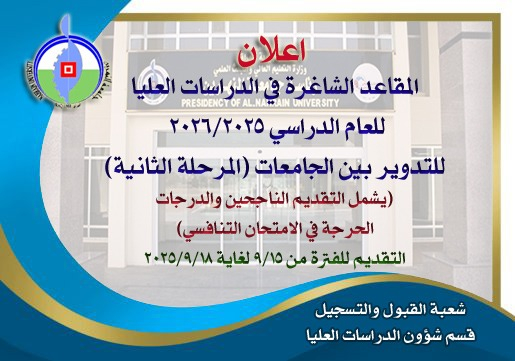 وفي أدناه رابط اعلان المقاعد الشاغرة المتوفرة في كليات جامعة النهرين للغرض اعلاه.