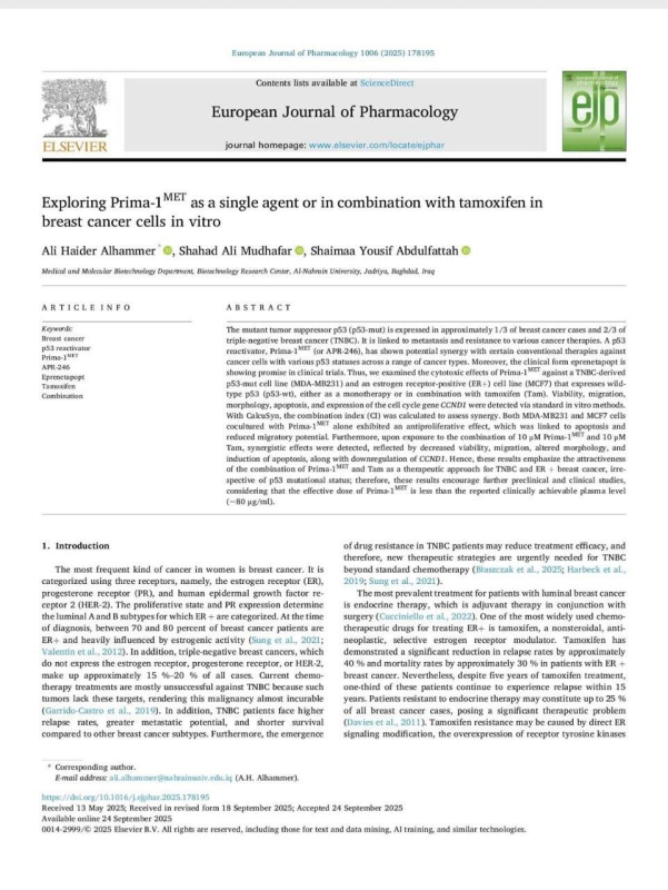 نشر فريق بحثي من مركز بحوث التقنيات الأحيائية في جامعة النهرين بحثاً علمياً في مجلة عالمية بعنوان : “Exploring Prima-1MET as a single agent or in combination with tamoxifen in breast cancer cells in vitro” والمؤلف من الاستاذ المساعد الدكتور علي حيدر الحمر والاستاذ المساعد الدكتور شيماء يوسف عبد الفتاح و الباحثة شهد علي عبد الأمير.