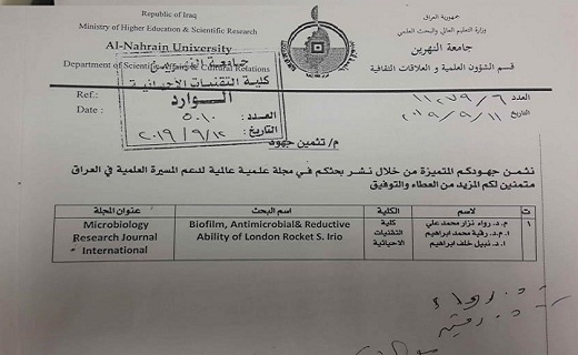 ثمن رئيس جامعة النهرين الاستاذ الدكتور محمد صاحب مهدي الطائي جهود فريق بحثي في كلية التقنيات الاحيائية بجامعة النهرين ضم الاستاذ الدكتورنبيل خلف ابراهيم, والاستاذ المساعد الدكتورة رقية محمد ابراهيم والدكتورة رواء نزار محمد وذلك لنشرهم بحثاً علمياً في مجلة عالمية ضمن مستوعبات سكوبس بعنوان الفعالية المثبطة للغشاء الحيوى والمضادة للميكروبات واختزال الجذور الحرة لنبات الخوبه.
