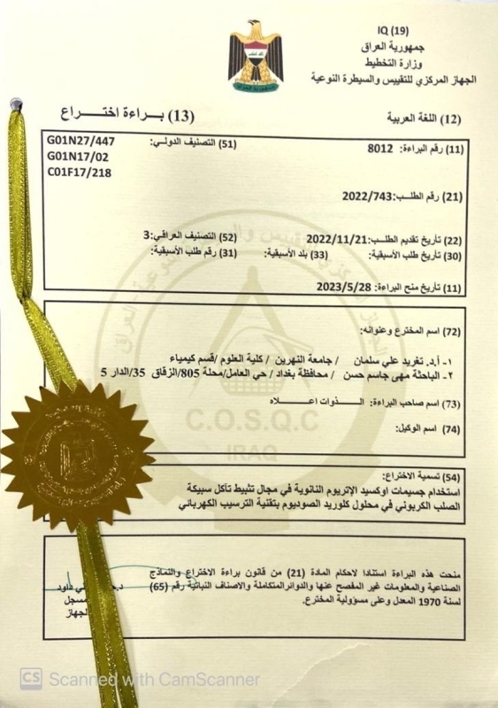 حصلت الاستاذ الدكتوره تغريد علي سلمان رئيس قسم الكيمياء في كلية العلوم جامعة النهرين على براءة اختراع صادرة عن الجهاز المركزي للتقييس والسيطرة النوعية عن استخدام جسيمات اوكسيد التنكستن النانوية المحضرة حرارياً لتثبيط تآكل سبيكة الفولاذ منخفض الكربون في الوسط الملحي