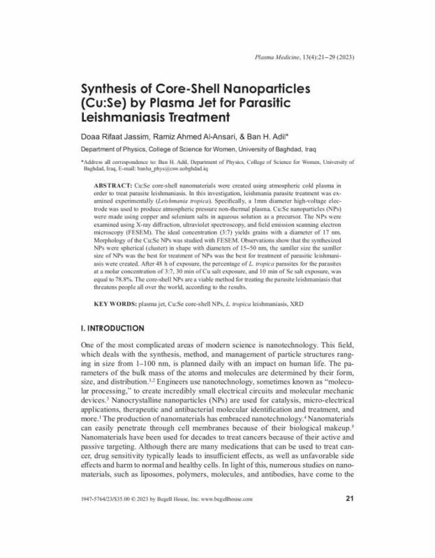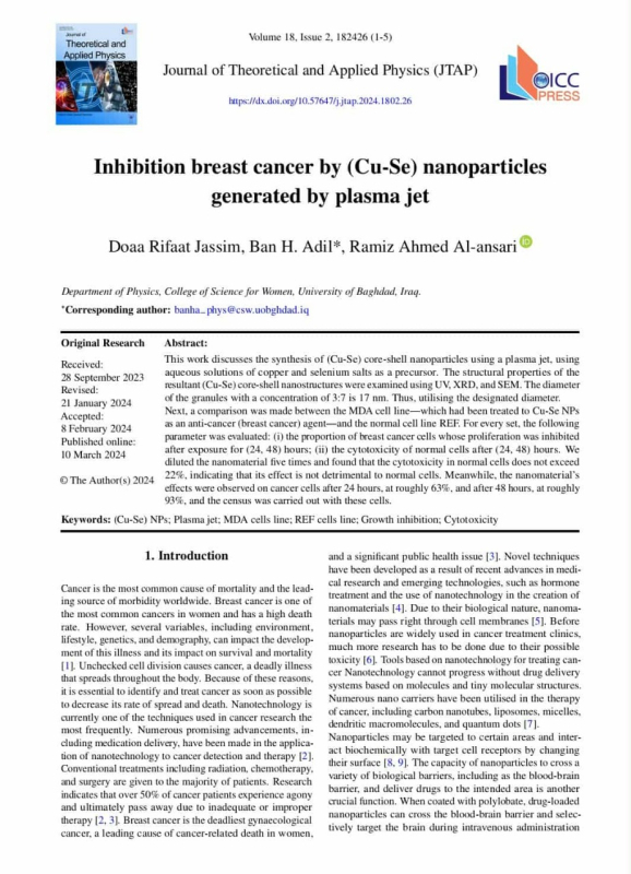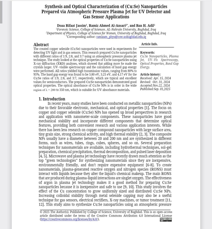 نشرت المدرس المساعد دعاء رفعت جاسم، التدريسية في قسم الأدلة الجنائية بكلية العلوم بجامعة النهرين، ثلاثة بحوث علمية متقدمة تناولت تقنيات تخليق وتوصيف الجسيمات النانوية من نوع (Cu:Se)، وتطبيقاتها الواعدة في مجالات طبية وعلمية متنوعة.