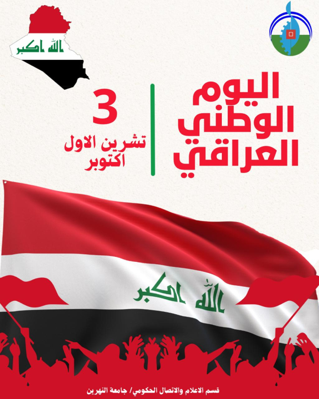 تتقدم رئاسة جامعة النهرين، برئاسة الأستاذ الدكتور علي عبد العزيز الشاوي، بأسمى آيات التهاني والتبريكات إلى أبناء الشعب العراقي العزيز بمناسبة اليوم الوطني العراقي، ذكرى توحيد الكلمة وبناء الدولة العراقية الحديثة.