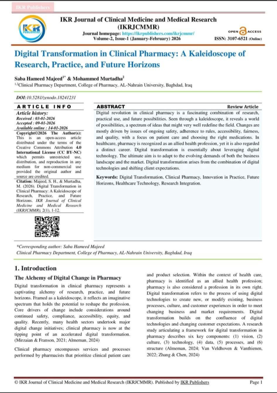 وتوصل البحث إلى أن التحول الرقمي يمثل محورًا أساسيًا في تطوير خدمات الصيدلة السريرية، ويسهم في تقليل الأخطاء الدوائية وتحسين الالتزام العلاجي، فضلًا عن أهمية دمج الأنظمة الرقمية ضمن الممارسات الصيدلانية والتعليم الصيدلاني المعاصر.