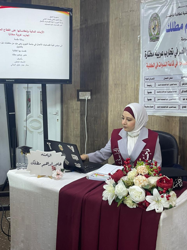 ناقش قسم اقتصاديات إدارة الصيرفة والتمويل في كلية اقتصاديات الاعمال بجامعة النهرين، رسالة الماجستير للطالبة هاجر إبراهيم مطلك، الموسومة «الأزمات المالية وانعكاساتها على القطاع المصرفي: تجارب عربية مختارة».