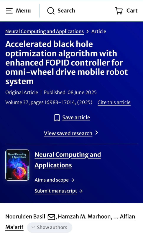 نشر التدريسي في قسم هندسة المنظومات في كلية هندسة المعلومات بجامعة النهرين، المدرس حمزة محمد مرهون، بحثًا علميًا مشتركًا في مجلة Neural Computing and Applications العالمية المصنّفة ضمن مستوعبات سكوبس في الربع الأول (Q1).