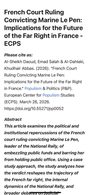 واستعرضت الدراسة التفسيرات المتباينة للحكم، بين اعتباره تجسيدًا للمساءلة القانونية أو انعكاسًا لاستهداف سياسي، مع تقييم تأثيره في اتجاهات الرأي العام والفرص الانتخابية قبيل الانتخابات الرئاسية الفرنسية لعام 2027.