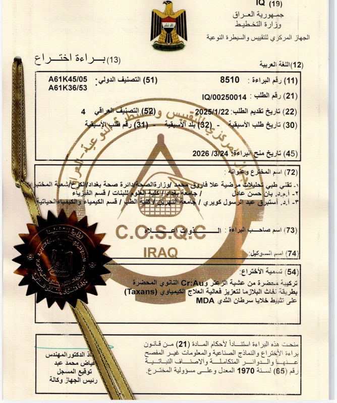 وتتعلق براءة الاختراع بتطوير تركيبة علاجية مبتكرة تعتمد على مستخلص عشبة الزعتر مدعمة بجسيمات نانوية من الذهب والكروم باستخدام تقنية نفث البلازما، بهدف تعزيز فعالية العلاج الكيميائي من نوع (Taxanes) في تثبيط نمو خلايا سرطان الثدي.