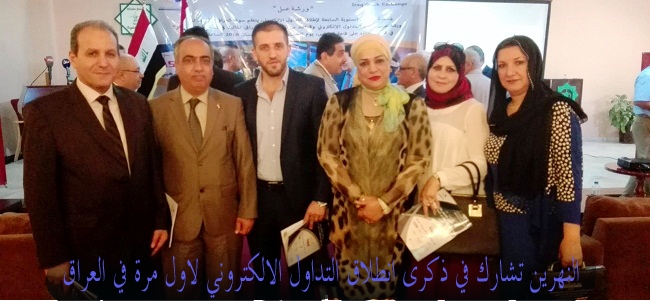 جامعة النهرين حاضرة في المشهد العلمي والثقافي العراقي عبر التعاون مع وزارات ومؤسسات الدولة والمؤسسات المحلية ولكلية اقتصاديات الاعمال ظهور فاعل وحضور مستمربشكل بناء في اغلب الانشطة الاقتصادية البحثية والتطبيقية وبمناسبة الذكرى السنوية السابعة لانطلاق اول تداول الكتروني في العراق نظم سوق العراق للاوراق المالية ورشة عمل بعنوان (دور التداول الالكتروني وقواعد سوق العراق للاوراق المالية في تنشيط الاستثمار) وتمثلت مشاركة جامعة النهرين في مجموعة من اعضاء الهيئة التدريسية لكلية اقتصاديات الاعمال وهم كل من الدكتورة نغم حسين نعمة والدكتورة سلام عبد الجليل الشامي والدكتورة سحر فتح الله والمدرس المساعد احمد ابراهيم تناولت الورشة محاور عن رؤية سوق العراق للأوراق المالية عن متطلبات تنشيط سوق رأس المال ، وخطط التطوير الإلكتروني القادمة وآلية التداول عبر الانترنيت للمستثمرين ، مع تبادل وجهات النظر وتعزيز المقترحات بوجهات النظر العلمية والاكاديمية في حقل الاختصاص مع تفعيل سياسة جذب الاستثمار في الاوراق المالية و القطاع المصرفي واستراتيجية الاصلاح و دور شركات الاستثمار المالي في تنشيط الاستثمار بالإضافة إلى موضوعات أخرى تتعلق بنشاطات الشركات المساهمة .