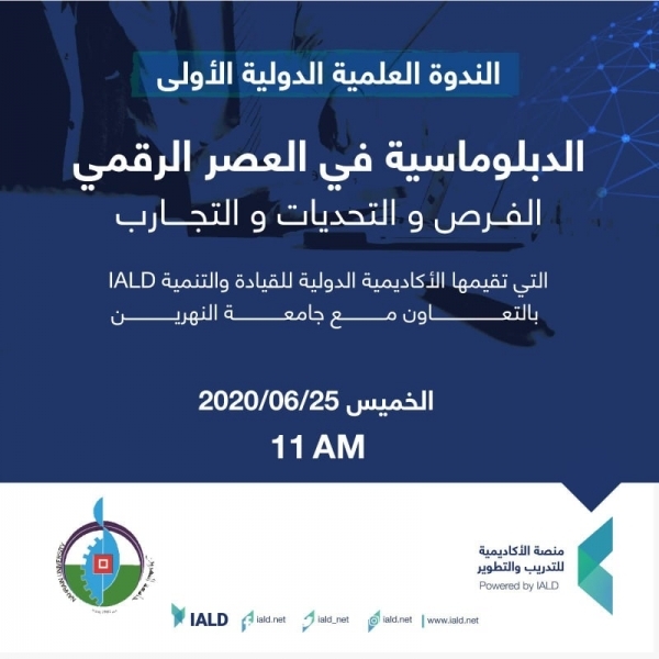 الندوة العلمية الدولية الاولى..الدبلوماسية في العصر الرقمي ..الفرص والتحديات والتجارب.التي تقيمها الاكاديمية الدولية للقيادة والتنمية IALD بالتعاون مع جامعة النهرين في يوم الخميس المصادف 25/6/2020 في تمام الساعة الحادية عشر صباحا .