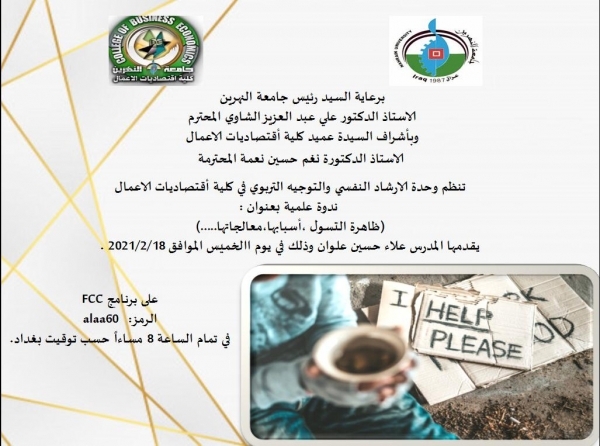 نظمت كلية الاقتصاديات الاعمال ، في جامعة النهرين ندوة علمية عن ظاهرة التسول اسبابها ومعالجتها بمشاركة عدد من الباحثين المختصين في هذا المجال.