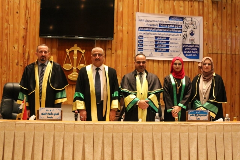 ناقشت كلية الحقوق بجامعة النهرين رسالة الماجستير الموسومة بـ " فاعلية اراء قضاة محكمة العدل الدولية في تطوير قواعد القانون الدولي ، للباحثة (( نجوى هادي محمد )) وذلك على قاعة المؤتمرات الكبرى في كلية الحقوق - جامعة النهرين.