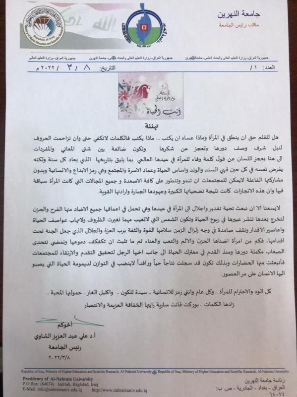 بمناسبة اليوم العالمي للمرآة قدم رئيس جامعة النهرين الاستاذ الدكتور علي الشاوي المحترم تهنئة الى كافة تدريسيات وموظفات الجامعة عبر فيها عن اعتزازه بأهمية دور المرآة في المجتمع