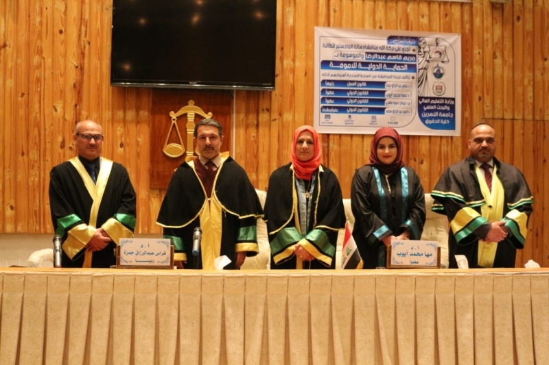 ناقشت كلية الحقوق في جامعة النهرين رسالة الماجستير الموسومة بـ " الحماية الدولية للامومة "" للباحثة ( مريم قاسم عبد الرضا ) وذلك على قاعة المؤتمرات الكبرى في كلية الحقوق - جامعة النهرين .