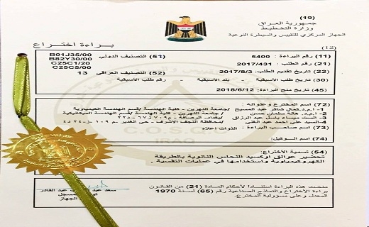 حصل الاستاذ المساعد الدكتور كمال شاكر عبد المسيح التدريسي في قسم الهندسة الكيمياوية والاستاذ المساعد الدكتورهالة سلمان حسن من قسم الهندسة الميكانيكية على براءة الاختراع موسومة بعنوان (تحضير عوالق اوكسيد النحاس النانوية بالطريقة الكهروكيمياوية واستخدامها في عمليات التقسية ) بمشاركة طلبة الماجستير ميساء باسل عزيز من قسم الهندسة الكيمياوية والطالب علي احمد عبد الغني من قسم هندسة الميكانيك.
