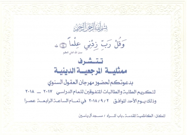 تتشرف رئاسة جامعة النهرين بدعوة طلبتها المتفوقين للعام الدراسي 2017-2018 لحضور مهرجان العقول السنوي المقام من قبل ممثلية المرجعية الدينية. سيكون مكان التكريم الكاظمية المقدسة / باب المراد / مسجد آل ياسين في تمام الساعة الرابعة عصراً. وسوف يتم توفير سيارات لنقل الطلبة وعوائلهم من الباب الرئيسي لجامعة النهرين شارع أبي نؤاس إلى منطقة الكاظمية المقدسة والعودة بهم . علماً ان موعد الانطلاق سيكون الساعة الثالثة عصراً من يوم الاحد الموافق 2/9/2018 .