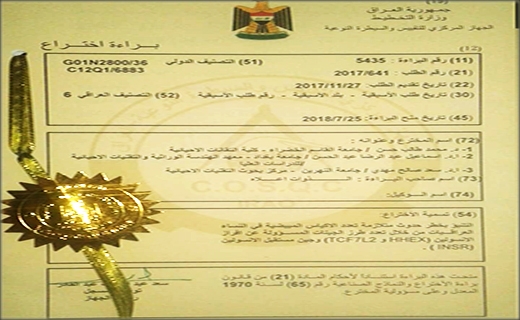 حصل التدريسي من مركز بحوث التقنيات الاحيائية بجامعة النهرين، الاستاذ الدكتور سعد صالح مهدي الدجيلي على براءة اختراع من الجهاز المركزي للتقييس والسيطرة النوعية في وزارة التخطيط الموسومة ( التنبؤ بخطر حدوث متلازمة تعدد الاكياس المبيضية في النساء العراقيات من خلال تعدد طرز الجينات المسؤولة عن افراز الانسولين
