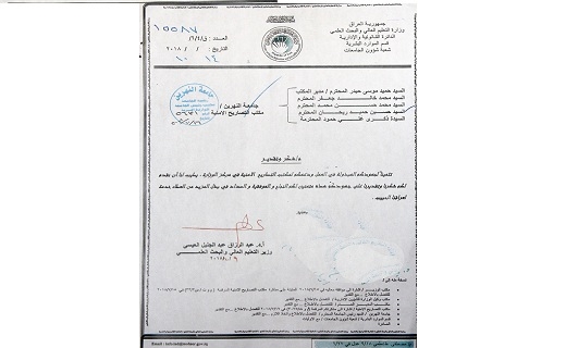 تمثل التثمين توجيه كتاب شكر وتقدير الى السيد مديرالمكتب، حميد موسى حيدر والسادة محمد خالد جعفر ومحمد حسن محمد وحسين حميد ريحان والانسة ذكرى علي حمود، متمنيا لهم دوام النجاح والموفقية ومزيد من العطاء خدمة لعراقنا العظيم.