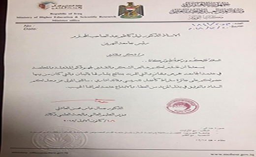 وجه وزيرالتعليم العالي والبحث العلمي السابق الدكتور جمال العادلي كتاب شكر وتقدير الى رئيس جامعة النهرين الاستاذ الدكتور نبيل كاظم عبد الصاحب استذكارا لحصوله على جائزة سقراط الدولية الصادرة عن جامعة اوكسفورد في المملكة البريطانية المتحدة والتي منحت لافضل خمسون قائدا في العلم والتعلم على المستوى الدولي، وتمثل هذه الجائزة إضافة نوعية لمؤسسات التعليم العالي والبحث العلمي وما حققته الكفاءات العلمية العراقية من تبوء مكان المقدمة أسوة بكبريات المؤسسات الرصينة .
