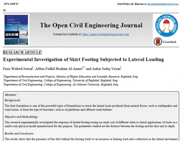 نشر التدريسي في كلية الهندسة بجامعة النهرين المدرس أزهر صادق ياسين بحثا في مجلة الهندسة المدنية المفتوحة عن دراسة مختبرية لنموذج اساس سطحي متصل بجدار محيطي لمقاومة الاحمال الجانبية المسلطة على الاساس.