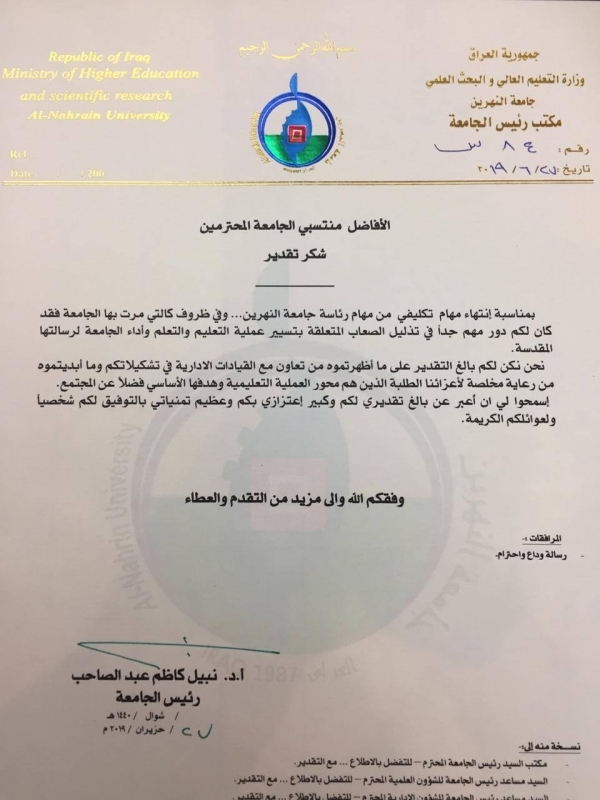 وجه رئيس جامعة النهرين الاستاذ الدكتور نبيل كاظم عبد الصاحب كتاب شكر وتقدير الى منتسبي الجامعة بمناسبة انهاء مهام تكليفه من رئاسة الجامعة نظرا للدور الذي اظهره منتسبي الجامعة في تذليل العقبات المتعلقة بتسيير عملية التعليم والتعلم واداء الجامعة لرسالتها المقدسة فيما يلي نصه " ...