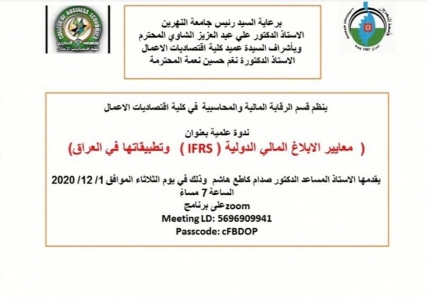 نظم قسم الرقابة المحاسبية والمالية في كلية اقتصاديات الاعمال بجامعة النهرين، ندوة علمية عن معايير الابلاغ المالي الدولية ( IFRS) وتطبيقاتها في العراق، قدمها الدكتور صدام كاطع هاشم.