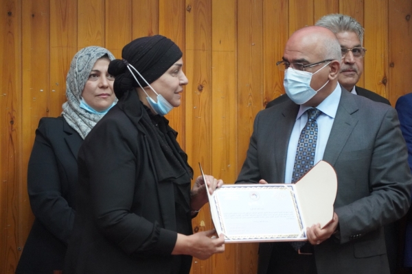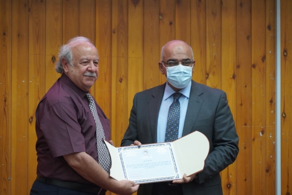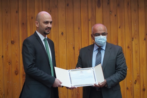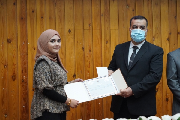 وكرم سيادته من كلية الهندسة التدريسي عبد الرزاق فيصل محمد لحصوله على المرتبة الاولى لجائزة براءات الاختراع والملكية الفكرية المميزة، كما حصل مركز بحوث التقنيات الاحيائية على المركز الثاني بجائزة المركز او الوحدة المميزة، اما عن جائزة مشروع التخرج المميز فقد حصلت الطالبة ريحانة سعد نجم، من كلية الطب على المركز الثاني.