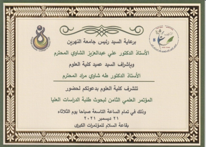 تستعد كلية العلوم في جامعة النهرين، لافتتاح جلسات المؤتمر العلمي الثامن لبحوث طلبة الدراسات العليا، بمشاركة أكثر من اربعين بحثاً علمياً لطلبة الدراسات العليا في الماجستير والدكتوراه، لمختلف تخصصات العلوم وذلك على مدار يومي الثلاثاء والأربعاء الموافقين 28-2020/12/29 .