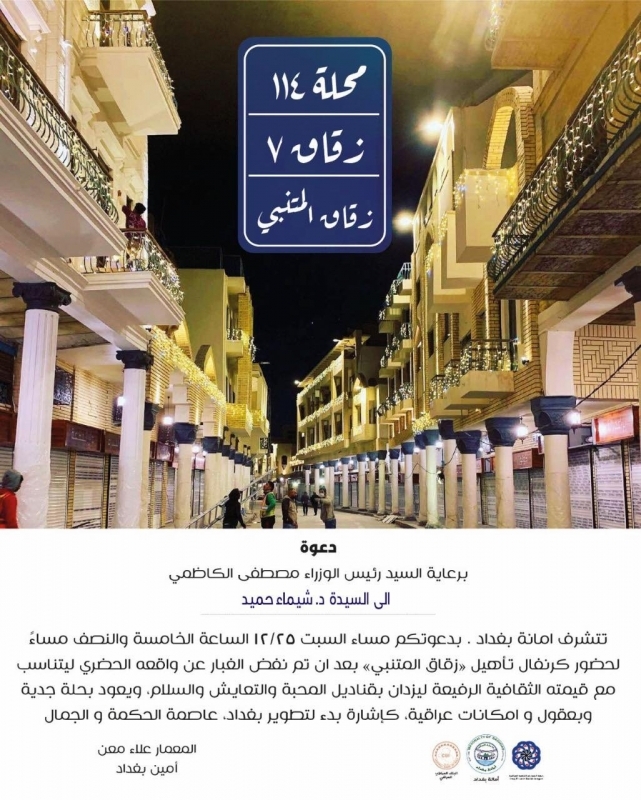 غمر الافتتاح اجواء من الفرح والبهجة بعد اعادة تأهيل زقاق المتنبي ضمن مشروع نهضة بغداد وذلك بعد ان تم نفض الغبار عن واقعه الحضري ليتناسب مع قيمته التراثية والتاريخية المهمة