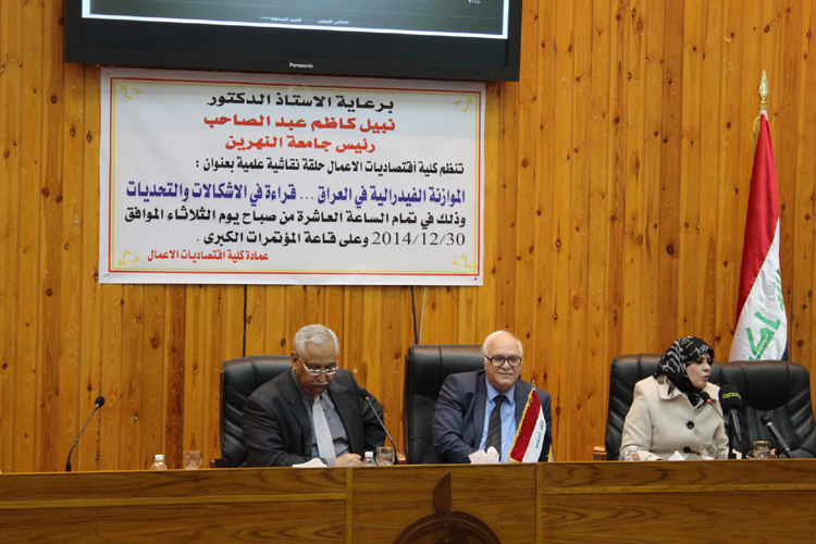 تجسيداً للدور العلمي والفكري والاقتصادي الذي تشهده جامعة النهرين، وتعزيزا للاسهام في حل الازمة المالية التي يواجهها العراق، نظمت كلية اقتصاديات الاعمال في جامعة النهرين، حلقة نقاشية علمية عن (الموازنة الفيدرالية في العراق قراءة في الاشكالات والتحديات) بمشاركة عدد من المختصين والخبراء في مؤسسات الدولة المختلفة.