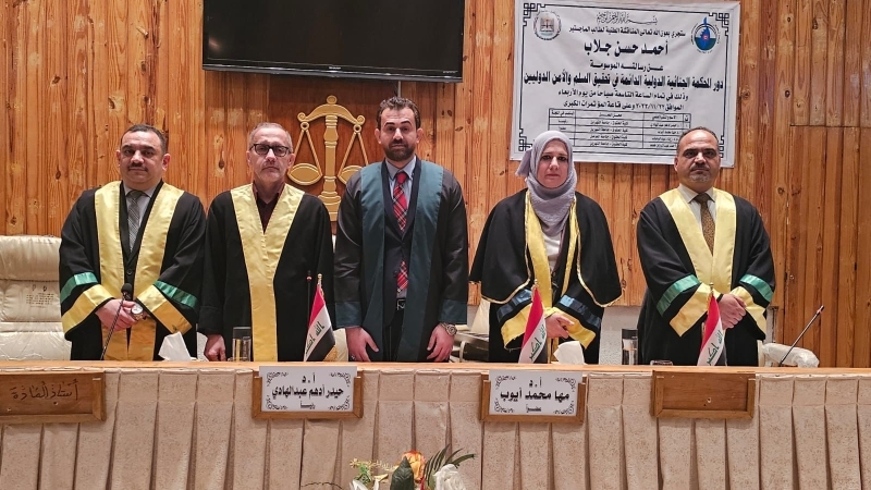ناقشت كلية الحقوق في جامعة النهرين رسالة ماجستير للطالب (احمد حسن جلاب) عن رسالته (دور المحكمة الجنائية الدولية الدائمة في تحقيق السلم والامن الدوليين) وذلك على قاعة المؤتمرات الكبرى في كلية الحقوق.