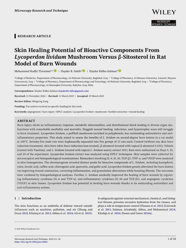 نشر الأستاذ الدكتور حيدر بهاء صاحب، عميد كلية الصيدلة في جامعة النهرين، بحثًا علميًا بعنوان:“القدرة العلاجية لمكونات فطر Lycoperdon lividum الحيوية في التئام جروح الحروق مقارنةً بـ β-Sitosterol في نموذج جرذي”،وذلك في مجلة Microscopy Research and Technique العالمية المحكمة.