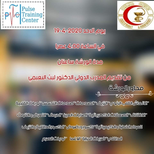 تدعوكم كلية الصيدلة والتعاون مع مركز النبض الدولي لحضور ورشة عمل الاسعافات الأولية إلكترونية بعنوان (( كن أنساناً وانقذ حياة )) وحسب منهاج جمعية القلب الامريكية وذلك يوم الاحد الموافق ١٩/٤/٢٠٢٠ في تمام الساعة الرابعة عصراً ولمدة ساعتين
